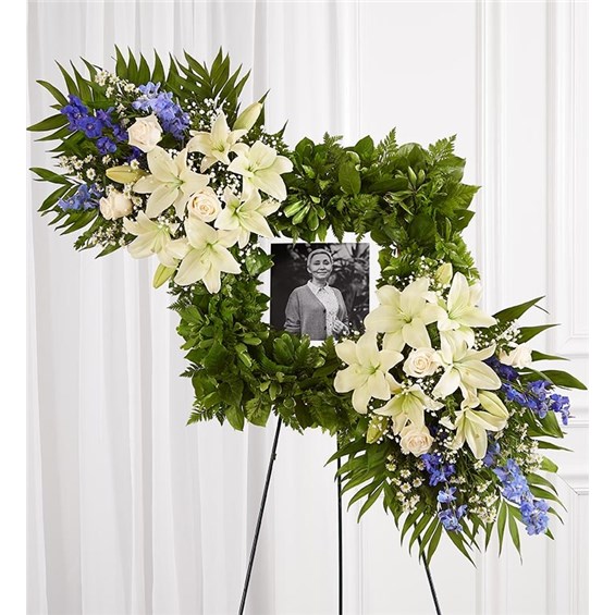 Celebrate the cherished memories you shared with a beautiful floral arrangement. Our unique design features a square wreath of greenery—perfect for displaying a photo—and two sprays on each end gathered with soothing blue & white blooms for a lush, full presentation. It’s a special tribute to honor the life of a loved one.